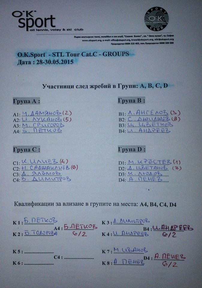 Видове игри: Схема на групи, всеки срещу всеки, като за елиминацийте на 1/4 Финал се класират първите двама от всяка група! Мачовете в групите и 1/4 Финал ще се играят в 1 тай-брек сет до 6 гейма, 1/2 Финали и Финал ще се играят в 2 тай-брек сета до 4 гейма и шампионски тай-брек до 10т.. Поставените играчи ще са 4, или 8 (при 2 или 4 групи) и ще се определят според ранглистата на лигата - STL Tour 2015. 1/2 Финали и Финали ще се играят в 2 тай-брек сета до 6 гейма и шампионски тай-брек до 10т.Регламент: Мачовете ще се провеждат по регламента на STL и O.K. Sport - Club ! Срещите в групите ще се играят в Петък вечер след 17.00ч., а елиминацийте от 1/4 финал до финал в след 14.00 ч. в Събота! В случай, на записани повече от 16 участника ще се проведат квалификаций в четвъртък 28.05'15 след 20.00ч. Право на участие в - Single Draw Category С имат всички играчи – мъже и жени отговарящи на условията за участие според регламента на STL Tour 2015г. т.е. да са класирани след 20-то място в ранглистата на STL 2015 !