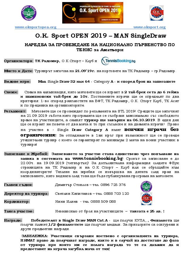 Записване и Жребий: Записването за участие става единствено чрез попълване на заявка в системата на www.tennisbooking.bg ! Срокът за записване е до 22.00ч. на 19.09.2019 (четвъртък)! За допълнителна информация следете ФБук страницата на ТК Радомир и на О.К Спорт – Клуб или се обръщайте към главния съдия или координаторите! Теглене на жребия се извършва на датата след края на записването, като веднага след това ще бъде публикувана програма на мачовете.